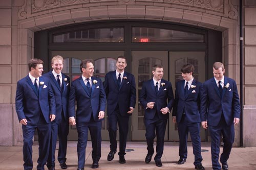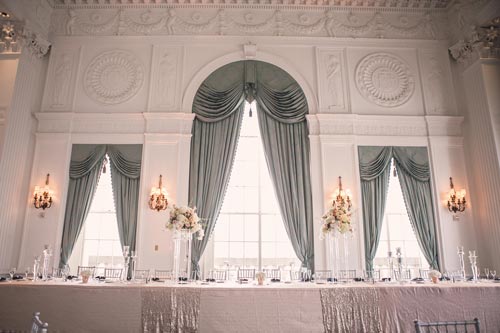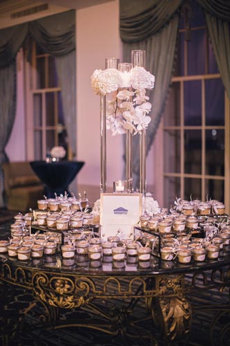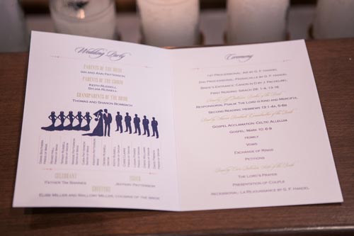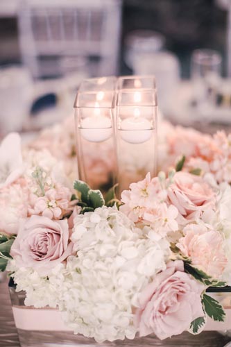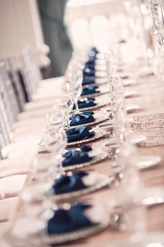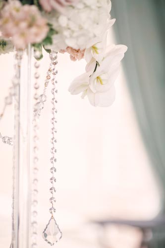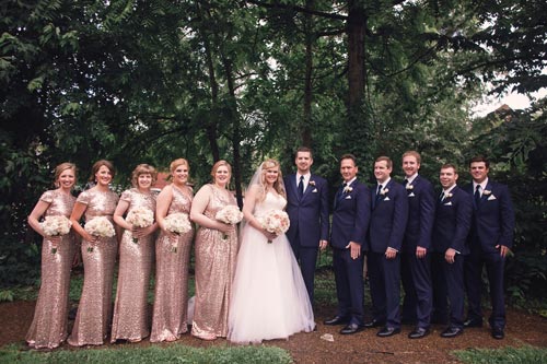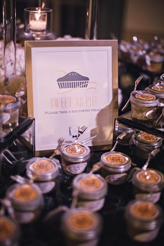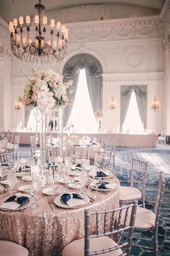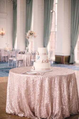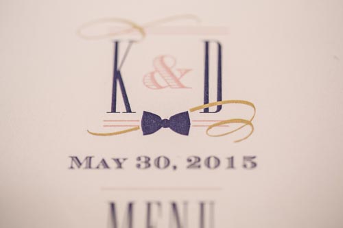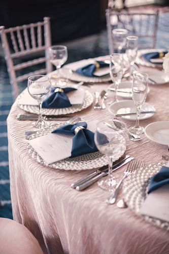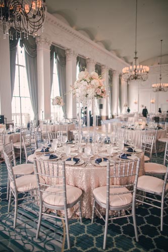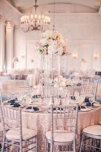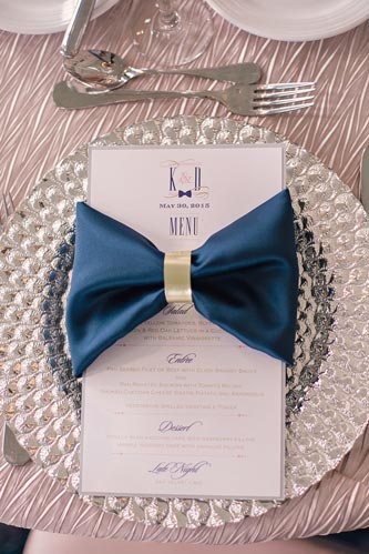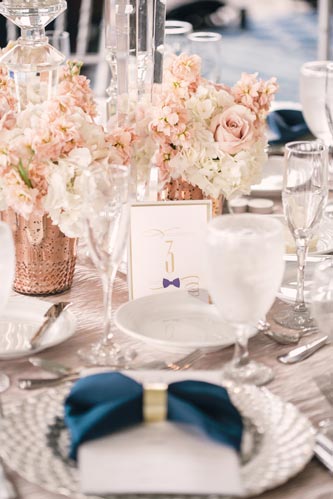 Kristen came to us with grand visions of sparkle and glam. We interpreted her design style into a “Kate Spade Preppy” look, having unique menus made that included an attached loop to hold the napkins, so that each person had a perfectly folded bowtie napkin. Kristen knew she wanted blush and navy so we focused more on the light colors and popped with the navy where we thought it was most impactful.